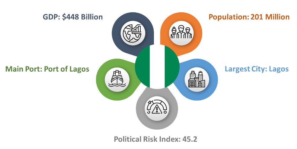 The Federal Republic of Nigeria is located in West Africa. It is bordered by Cameroon, Niger, Chad, and Benin. Nigeria is referred to as the `Giant of Africa’, due to its strong economy and large population. Its population reached 191 million in 2018 and Nigeria has the highest GDP in Africa with $375 Billion. Nigeria overtook South Africa in 2014 to become Africa’s largest economy. Nigeria is a member of the African Union, United Nations, OPEC, and Commonwealth.