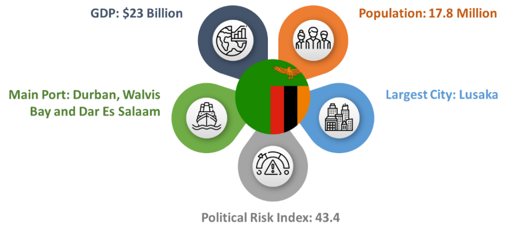 The Republic of Zambia is located in South-Central Africa and it is bordered by the Democratic Republic of Congo, Malawi, Mozambique, Zimbabwe, Botswana, and Tanzania. The population of Zambia is 17 million and its GDP is $25 Billion. Zambia gained independence from the United Kingdom in 1964 and the current constitution is effective since 2016. English is the official language. Its capital city is Lusaka with a population of around 2 million people. The headquarter of Common Market for Eastern and Southern Africa (COMESA) is located in Lusaka.