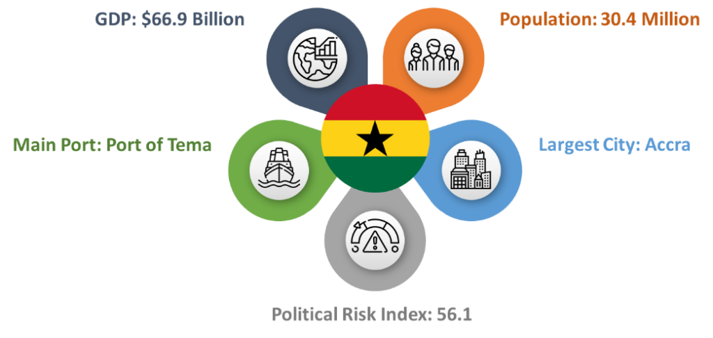 The Republic of Ghana is located in West Africa and it is bordered by Ivory Coast, Burkina Faso, and Togo. Ghana’s population is 29 million and its GDP is $47 Billion. Ghana is a member state of the Non-Aligned Movement, the African Union, the Economic Community of West African States (ECOWAS), Group of 24, and the Commonwealth of Nations.