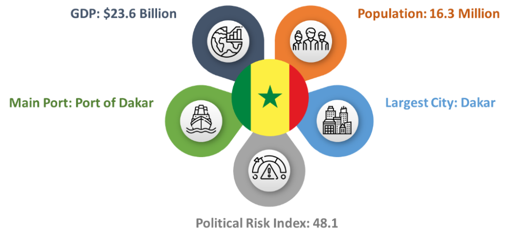 The Republic of Senegal is located in West Africa and it is bordered by Mali, Guinea, Guinea-Bissau, Gambia, and Mauritania. The population of Senegal is 16 million and its GDP is $16 Billion. Senegal gained independence from France in 1960. French is the official language. Its capital city is Dakar with a population of around 1 million people.