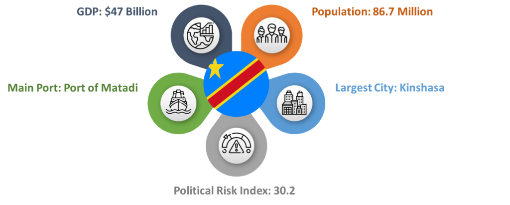 The Democratic Republic of the Congo is located in Central Africa and it is bordered by the Republic of Congo, Central African Republic, South Sudan, Uganda, Rwanda, Burundi, Tanzania, Zambia, and Angola. Congo’s population is 82 million and its GDP is $37 Billion. Congo is a member state of the United Nations, Non-Aligned Movement, African Union, and COMESA.