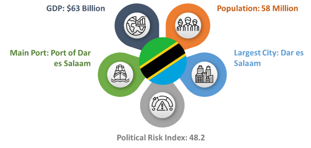 The United Republic of Tanzania is located in East Africa and it is bordered by Uganda, Kenya, Mozambique, Malawi, Zambia, Rwanda, Burundi, and the Democratic Republic of Congo. Tanzania’s population is 58 million and its GDP is $42 Billion.