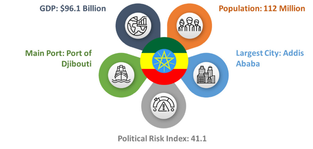 The Federal Democratic Republic of Ethiopia is located in North-East Africa and it is bordered by Eritrea, Djibouti, Somalia, Sudan, South Sudan, and Kenya. Ethiopia’s population is 105 million and its GDP is $81 Billion. Ethiopia is the headquarter of the African Union, the Pan African Chamber of Commerce and Industry, the United Nations Economic Commission for Africa, the African Standby Force, and many of the global NGOs focused on Africa.