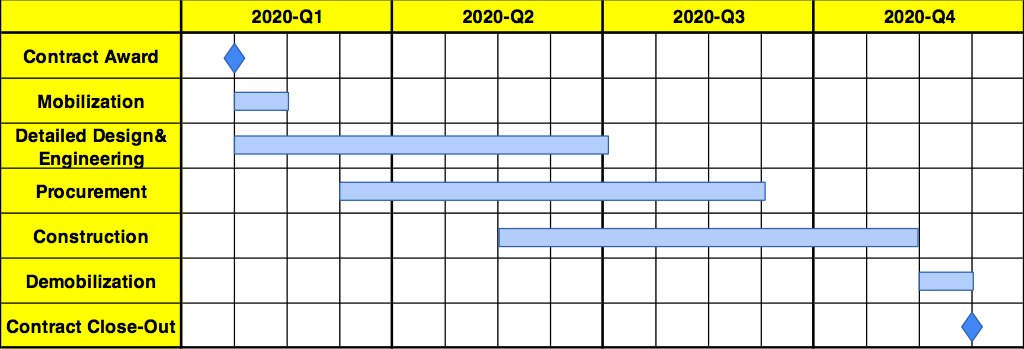The management of construction requires state-of-art project management knowledge aiming for completion of project objectives such as time, cost, scope, quality, stakeholder satisfaction, etc. A typical high-level construction schedule can be seen below.
